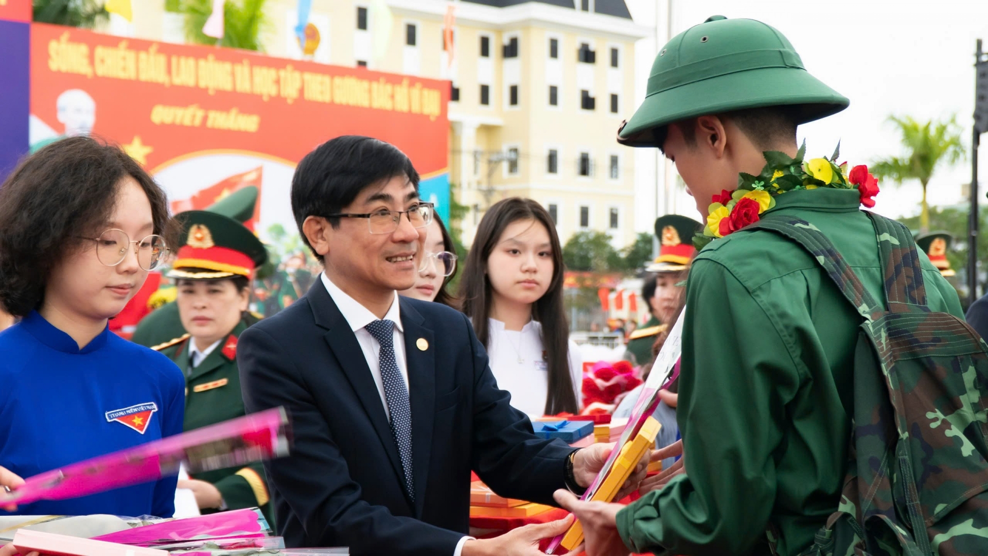 Ông Trần Thắng Lợi - Trưởng Ban Tuyên giáo và Dân vận Thành uỷ tặng hoa và quà động viên các thanh niên lên đường nhập ngũ