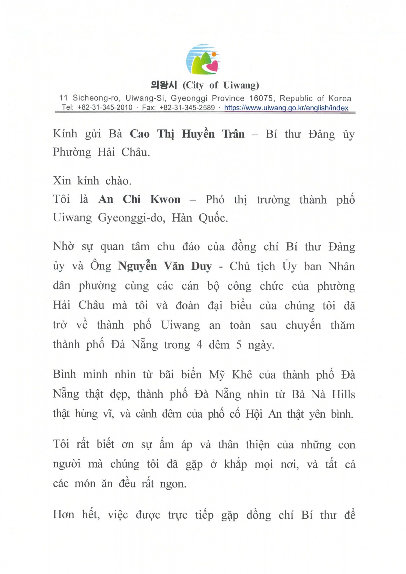 Ngày 11/8, ông An Chi Kwon Phó thị trưởng thành phố Uiwang Gyeonggi-do, Hàn Quốc đã có thư gửi bà Cao Thị Huyền Trân – Bí thư Đảng ủy phường Hải Châu và ông Nguyễn Văn Duy – Chủ tịch UBND phường Hải Châu.