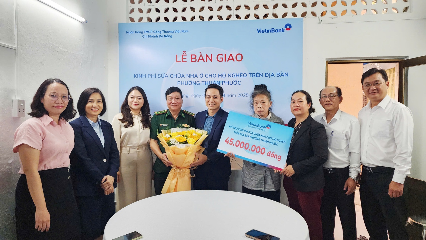 Bà Cao Thị Huyền Trân - Bí Thư Quận ủy Hải Châu cùng chính quyền địa phương, mạnh thường quân tại lễ bàn giao nhà sau sửa chữa của một hộ dân phường Thuận Phước trong đợt 1.