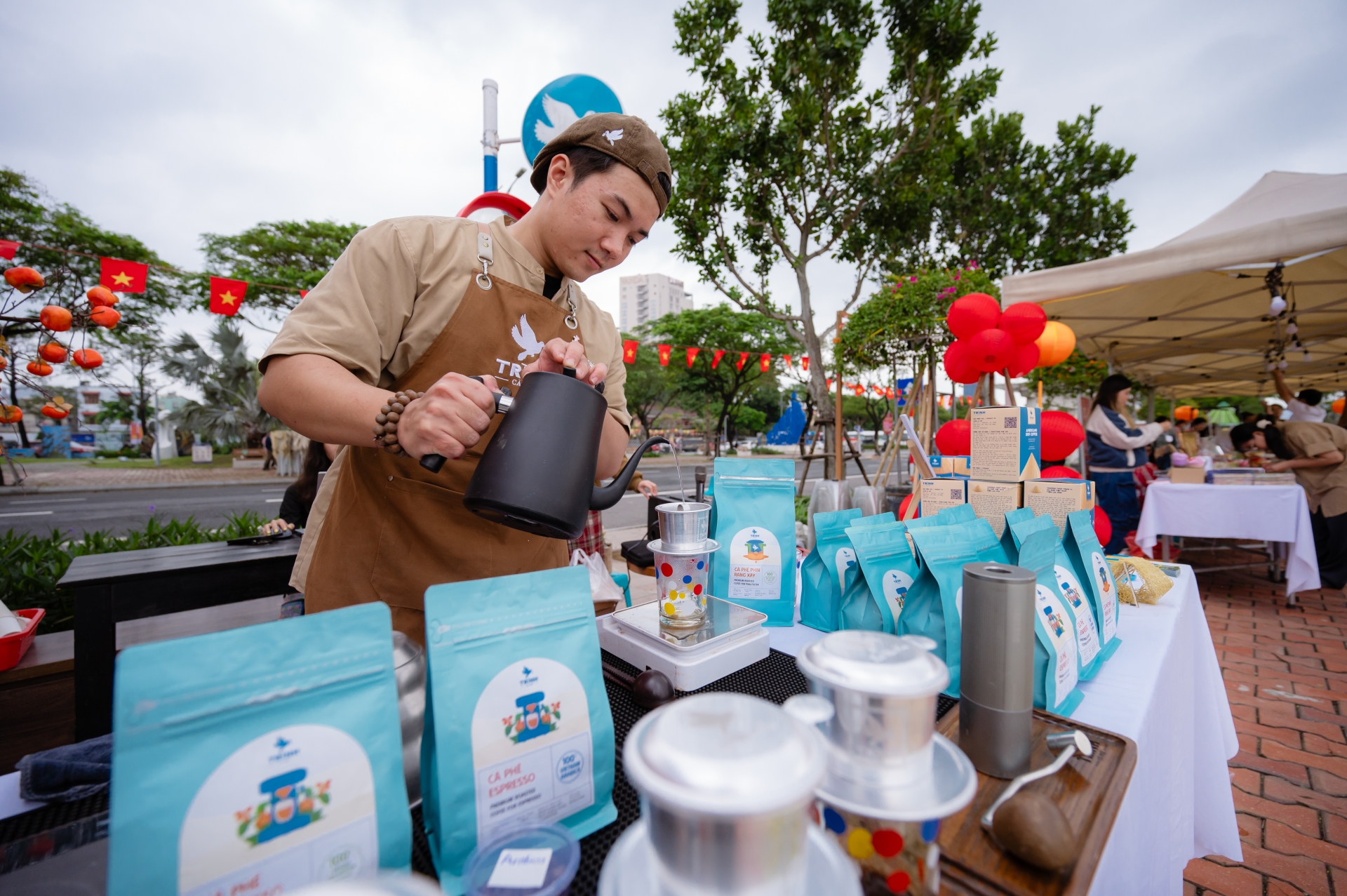 Các trò chơi dân gian như ô ăn quan, đi cà kheo hay nhảy sạp được tổ chức nhằm tái hiện những ký ức tuổi thơ quen thuộc. Đây cũng là dịp để các thế hệ trẻ trải nghiệm văn hóa truyền thống trong không gian vui tươi, cởi mở. Không gian phiên chợ còn đặc biệt ấn tượng với gian hàng của Trình Cà Phê, nơi mang đến những ly cà phê đậm đà hương vị Việt. Ngoài ra, các gian hàng còn bày bán mứt Tết và đặc sản địa phương cũng khiến người tham quan thích thú.