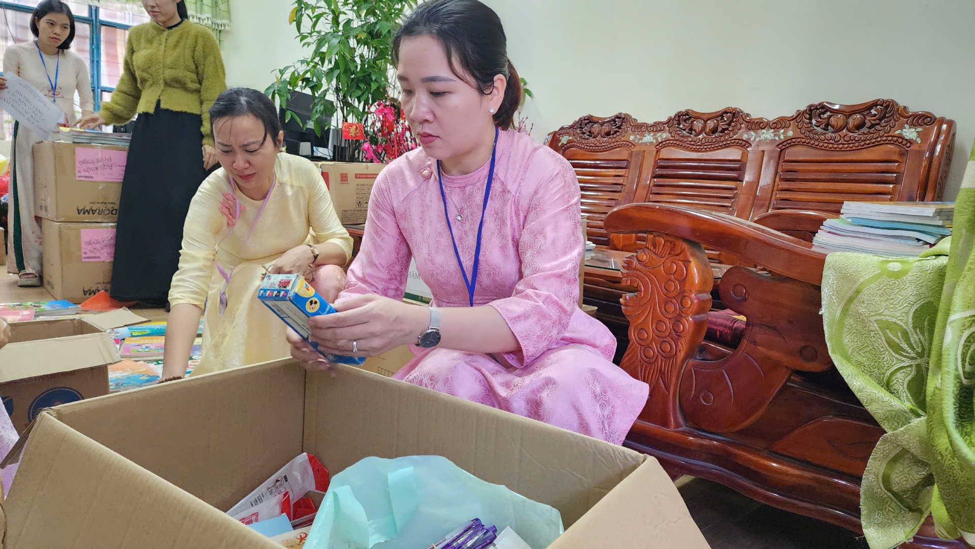 Nhìn những hình ảnh đó, các thầy cô rất hạnh phúc khi học trò của mình biết chia sẻ yêu thương. Họ cũng bỏ thời gian, công sức để phân loại, đóng thùng từng loại sách, vở.