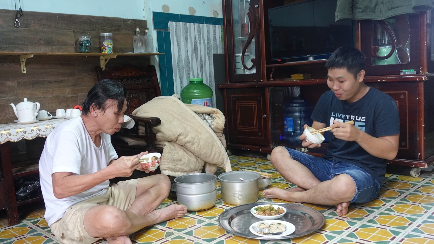 Huỳnh Anh Đức (bên phải) bên mâm cơm gia đình trong những ngày chuẩn bị lên đường nhập ngũ.