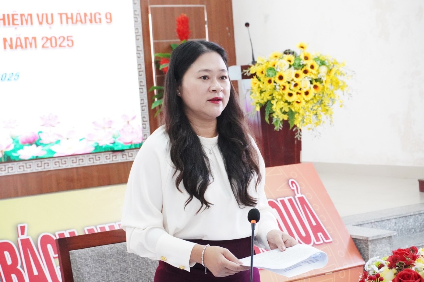 Đ/c Cao Thị Huyền Trân - Bí thư Đảng ủy kiêm Bí thư Chi bộ phát biểu tại hội nghị.