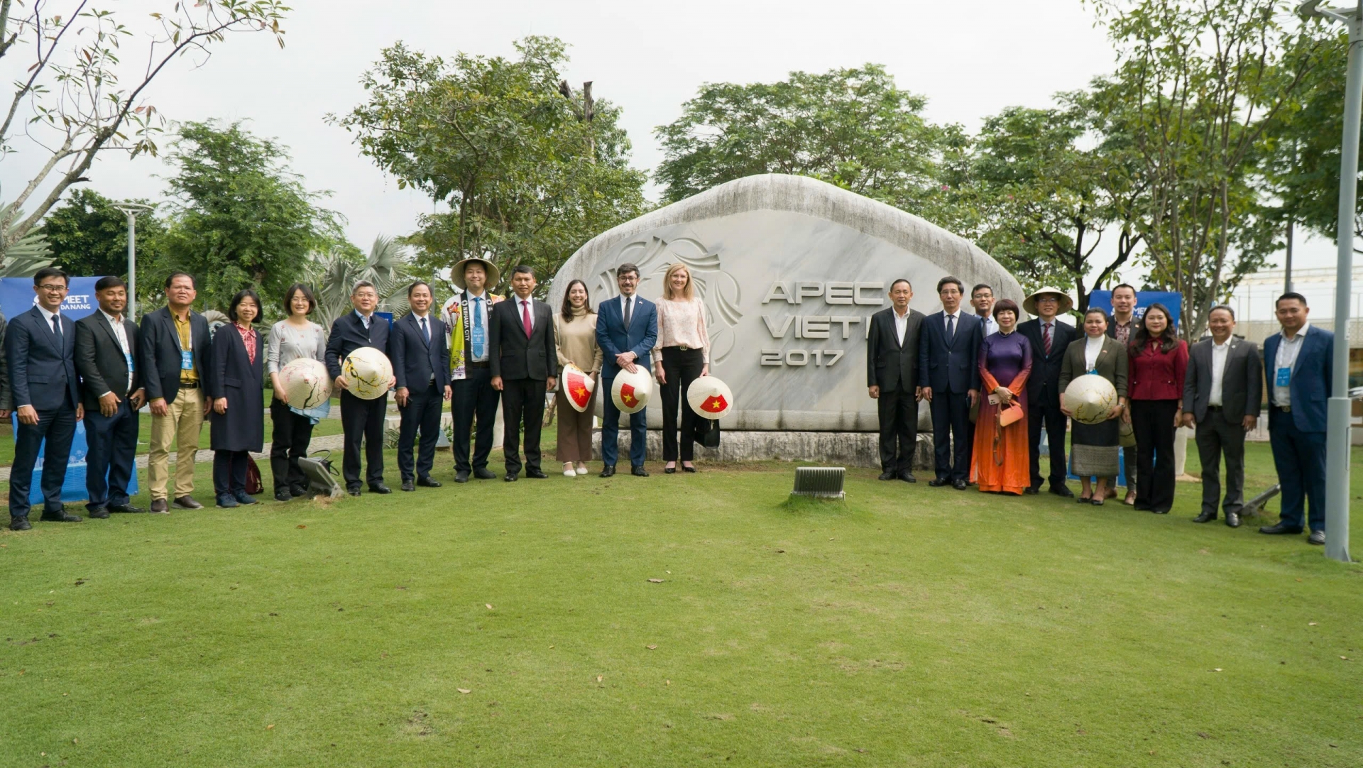 Sau khi nhận được nón lá, các đại biểu đã cùng chụp ảnh lưu niệm tại Vườn tượng APEC và tiếp tục tham quan đường hoa Bạch Đằng.