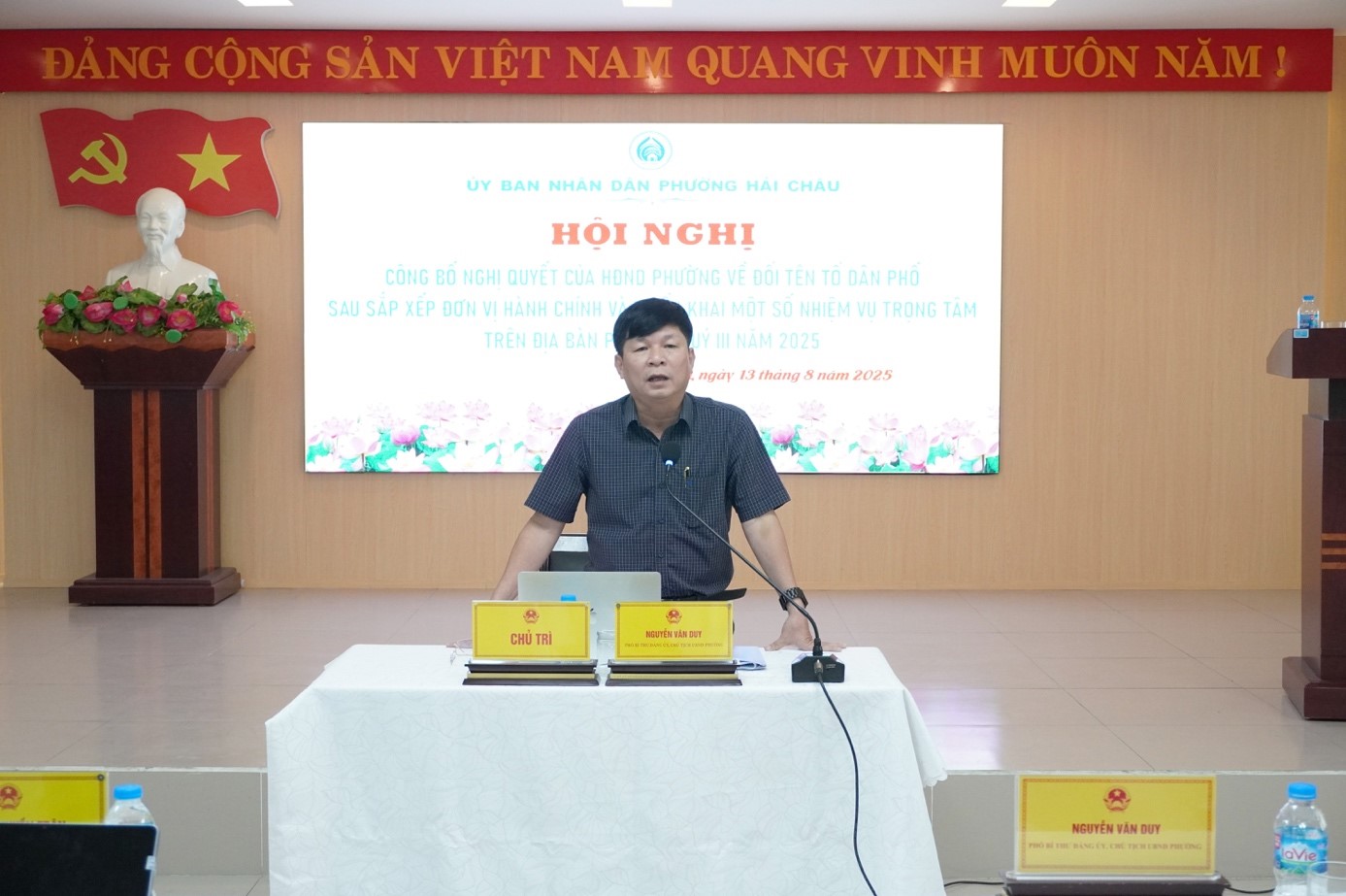 Chiều 13/8, UBND phường Hải Châu tổ chức hội nghị công bố Nghị quyết của HĐND phường về đổi tên Tổ dân phố sau sắp xếp đơn vị hành chính và triển khai một số nhiệm vụ trong thời gian đến trên địa bàn phường quý III năm 2025.
