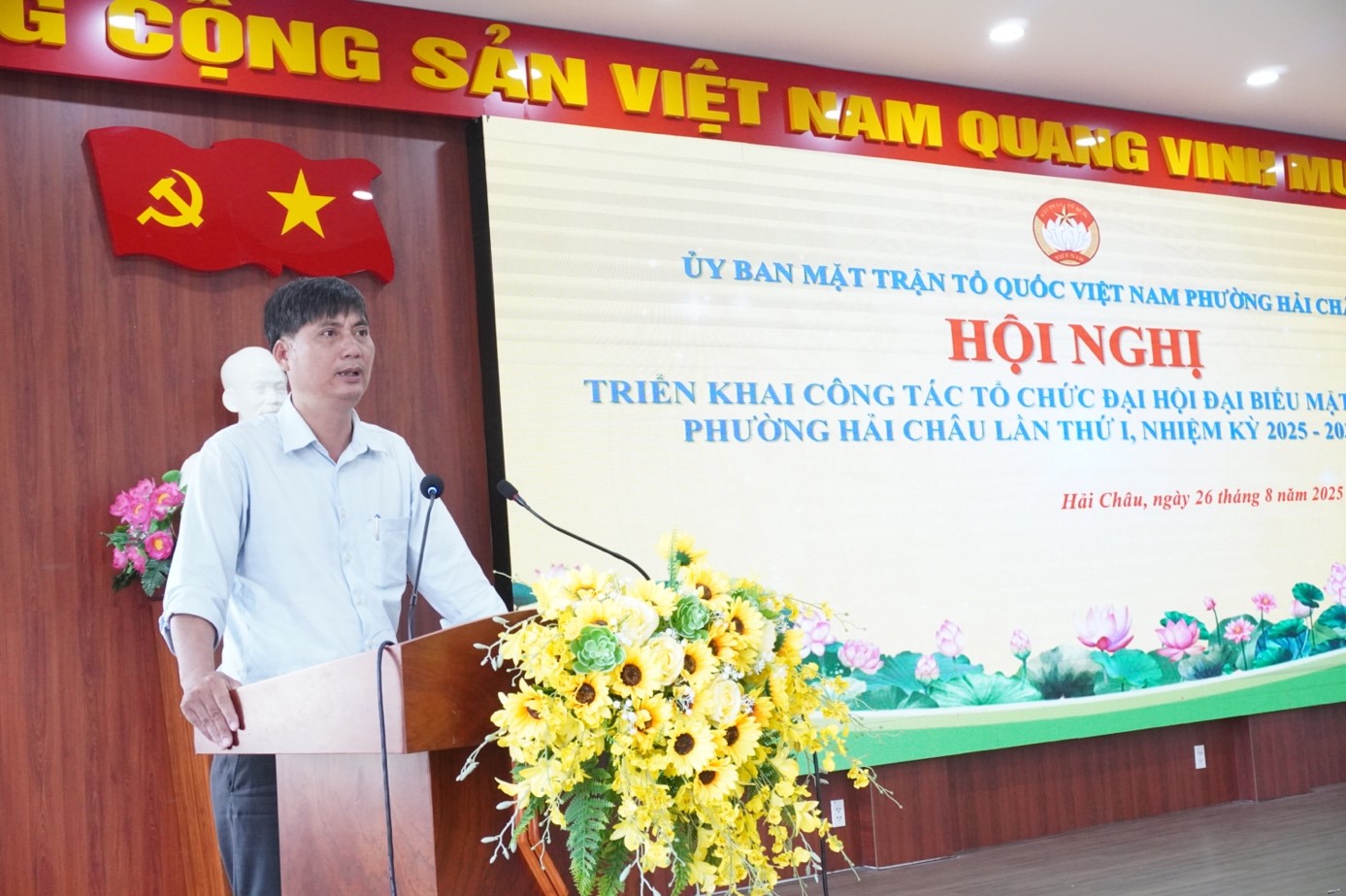 Ông Trần Thanh Bình - Ủy viên Ban Thường vụ Đảng ủy, Chủ tịch Ủy ban MTTQ Việt Nam phường đã triển khai kế hoạch tổ chức Đại hội đại biểu MTTQ Việt Nam phường Hải Châu lần thứ I, nhiệm kỳ 2025 – 2030 và đề án phân bổ đại biểu dự Đại hội và nội dung tổ chức Hội nghị Tổng kết Ban Công tác mặt trận nhiệm kỳ 2024 – 2026.
