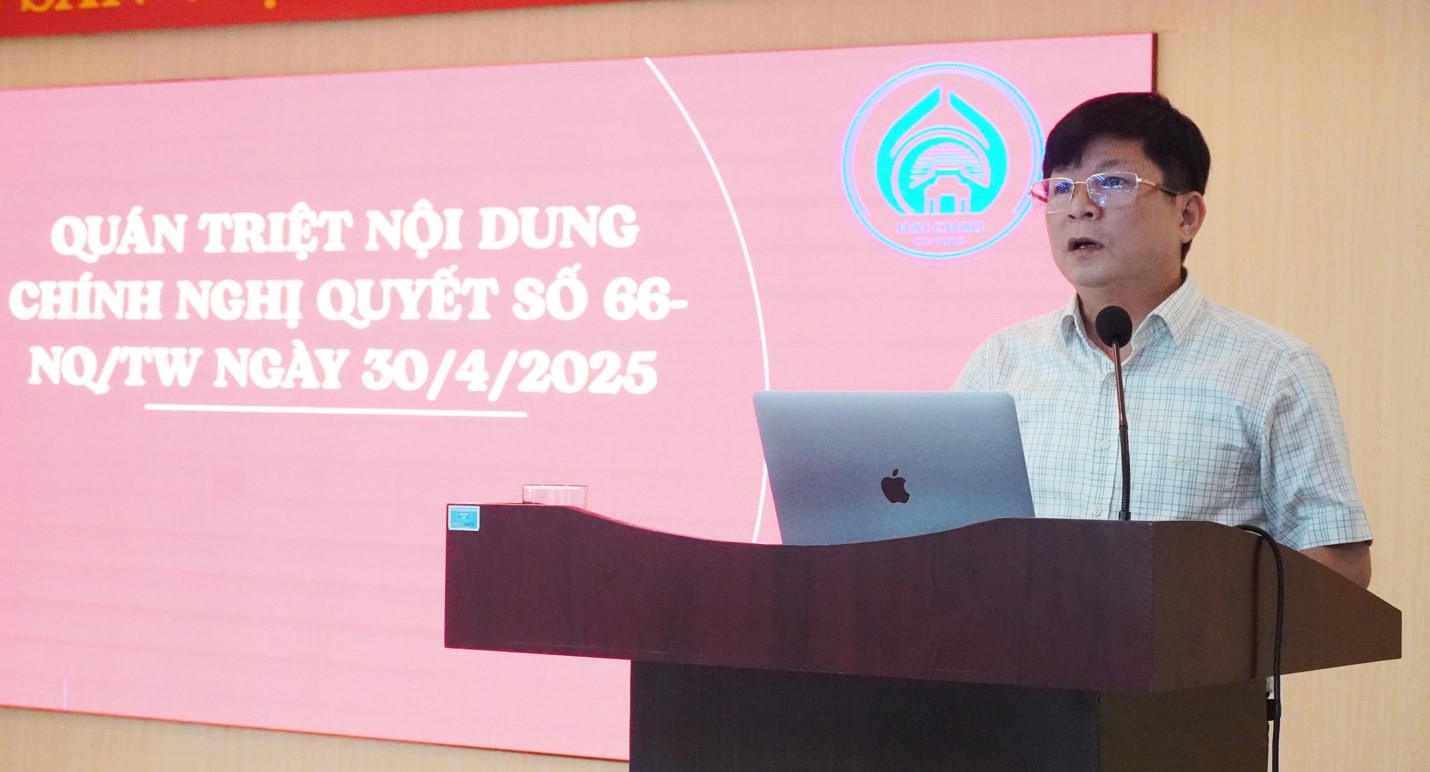 Đồng chí Nguyễn Văn Duy, Phó Bí thư Đảng uỷ, Chủ tịch UBND phường Hải Châu đã báo cáo Nghị quyết số 66-NQ/TW ngày 30/4/2025 của Bộ Chính trị về đổi mới công tác xây dựng và thi hành pháp luật đáp ứng yêu cầu phát triển đất nước trong kỷ nguyên mới; Nghị quyết số 68-NQ/TW ngày 04/5/2025 của Ban Chấp hành Trung ương về Phát triển kinh tế tư nhân.