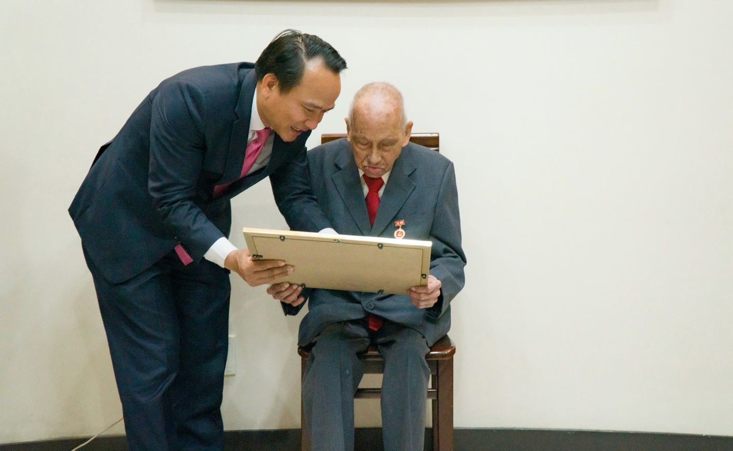 Đồng chí Nguyễn Đình Vĩnh - Phó Bí thư Thường trực Thành ủy Đà Nẵng giúp đồng chí Nguyễn Tập đọc từng dòng trên bảng Huy hiệu 80 năm tuổi Đảng.