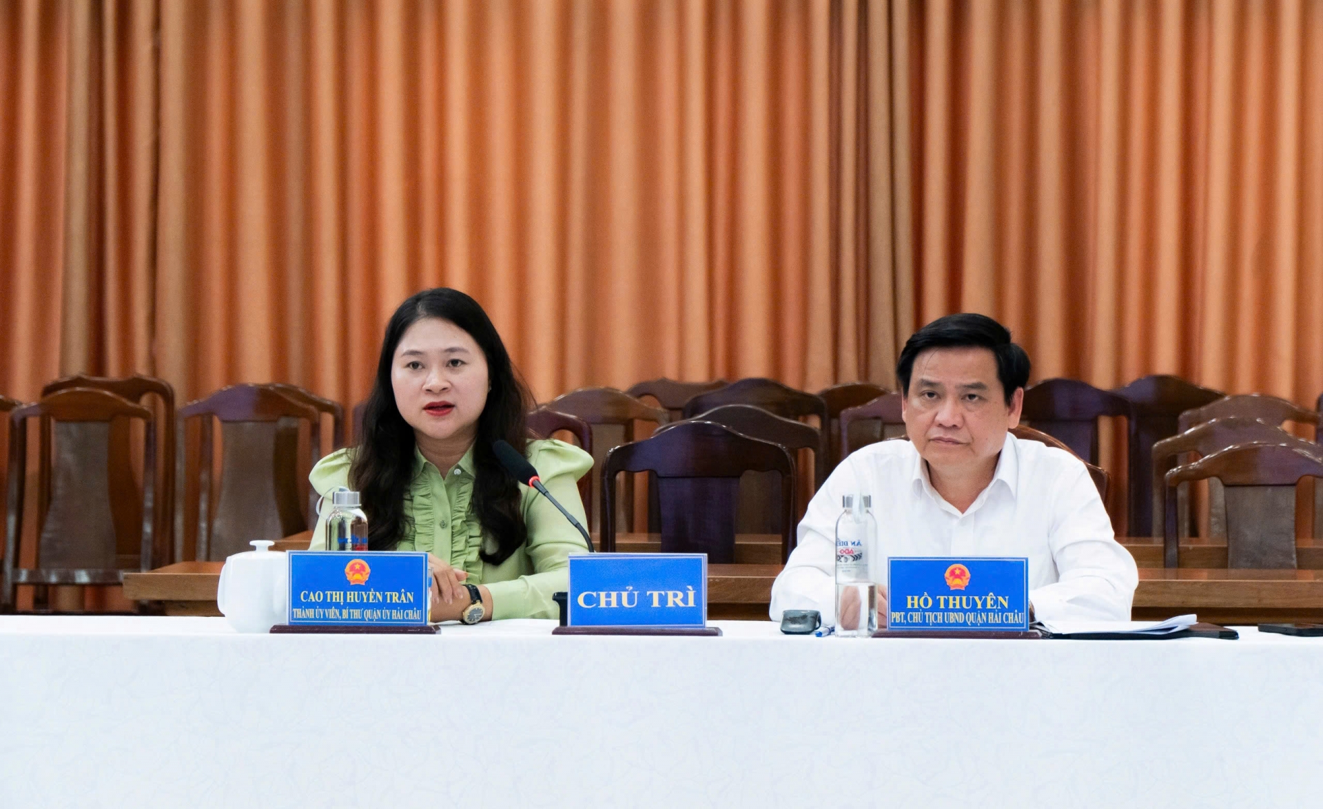 Bà Cao Thị Huyền Trân - Bí thư Quận uỷ Hải Châu và ông Hồ Thuyên - Chủ tịch UBND quận Hải Châu chủ trì cuộc họp.