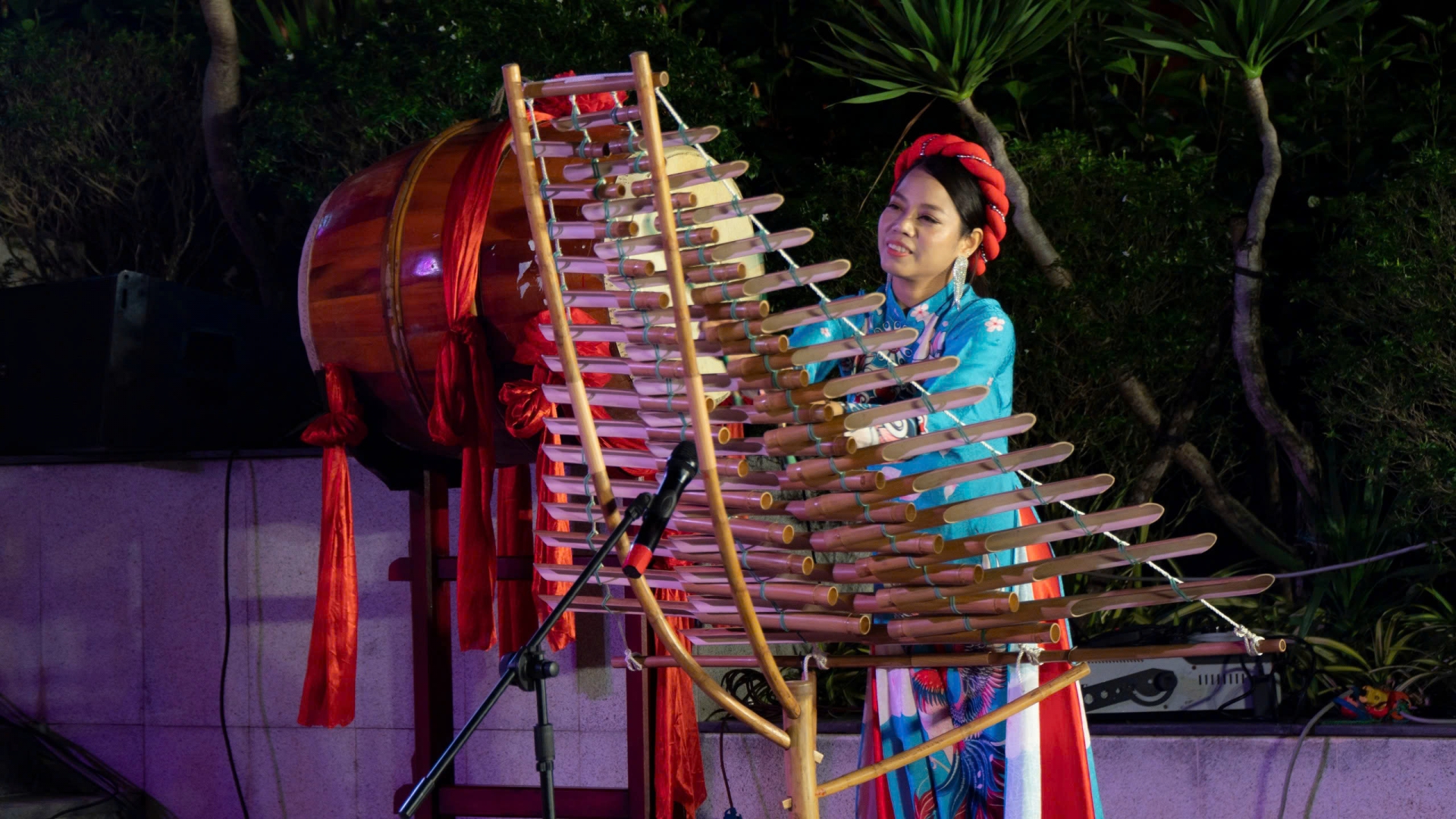 Ban Tổ chức thiết kế sân khấu mở ngoài trời. Khu vực trà đạo với những bàn tre mộc mạc, ấm trà ấm nóng phục vụ người dân và du khách đến tham quan, thưởng thức và nghe thơ Đêm Nguyên Tiêu giữa Công viên APEC.