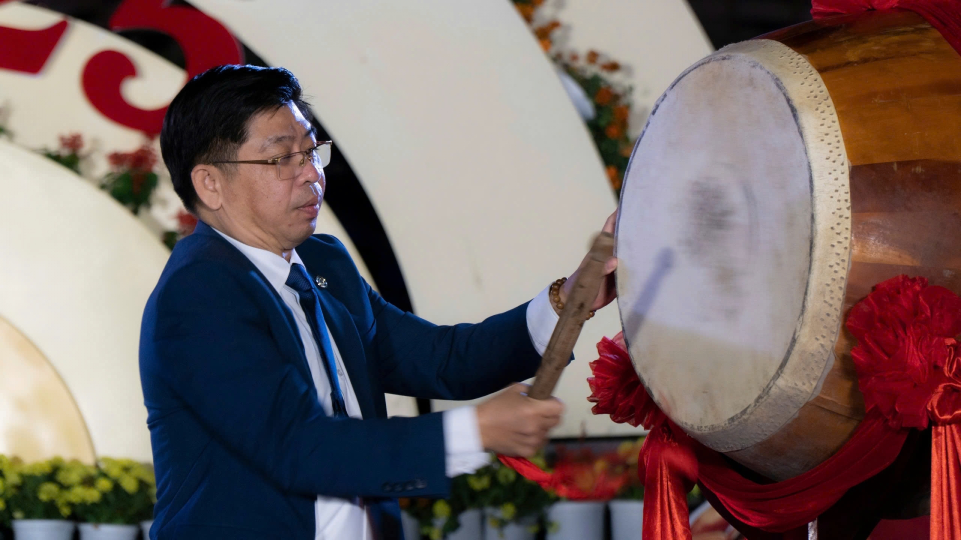 Ông Trương Thanh Dũng – Phó Chủ tịch UBND quận Hải Châu đánh trống khai mạc đêm thơ.