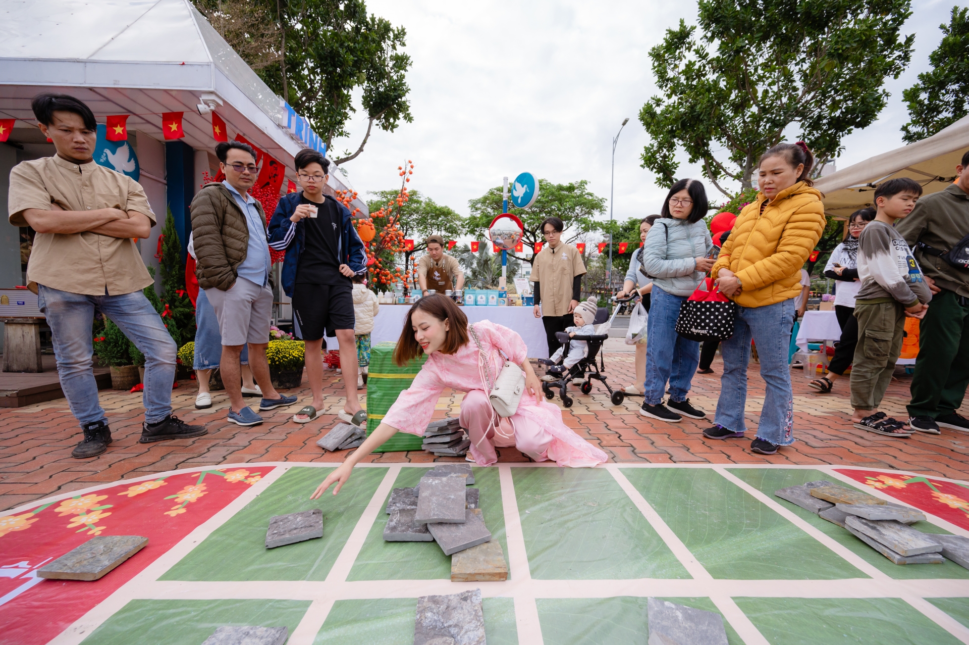 Các trò chơi dân gian như ô ăn quan, đi cà kheo hay nhảy sạp được tổ chức nhằm tái hiện những ký ức tuổi thơ quen thuộc. Đây cũng là dịp để các thế hệ trẻ trải nghiệm văn hóa truyền thống trong không gian vui tươi, cởi mở. Không gian phiên chợ còn đặc biệt ấn tượng với gian hàng của Trình Cà Phê, nơi mang đến những ly cà phê đậm đà hương vị Việt. Ngoài ra, các gian hàng còn bày bán mứt Tết và đặc sản địa phương cũng khiến người tham quan thích thú.